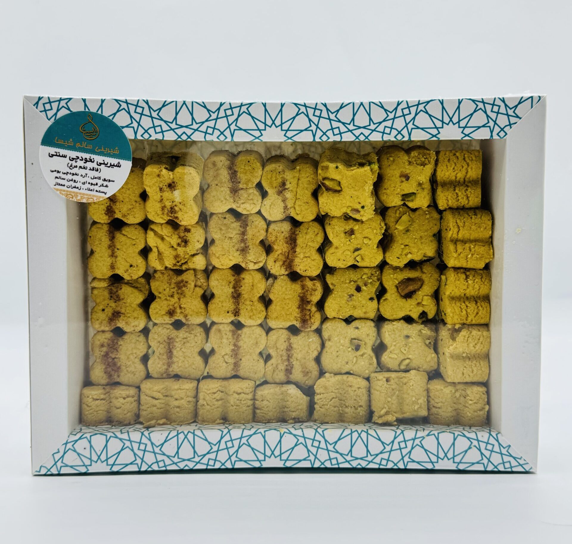 این شیرینی فاقد تخم مرغ و تهیه شده از سویق کامل، آرد نخودچی بومی، شکر قهوه ای، روغن سالم، پسته اعلا و زعفران ممتاز است.