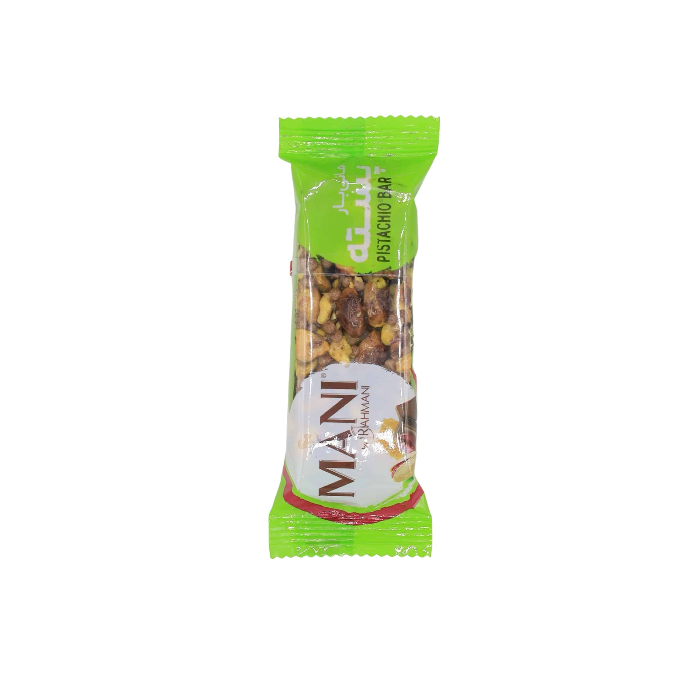 مانی بار پسته تهیه شده با : فرآورده های کاکائویی، شربت گلوکز، عسل، ذرت فراوری شده، روغن گیاهی آفتابگردان