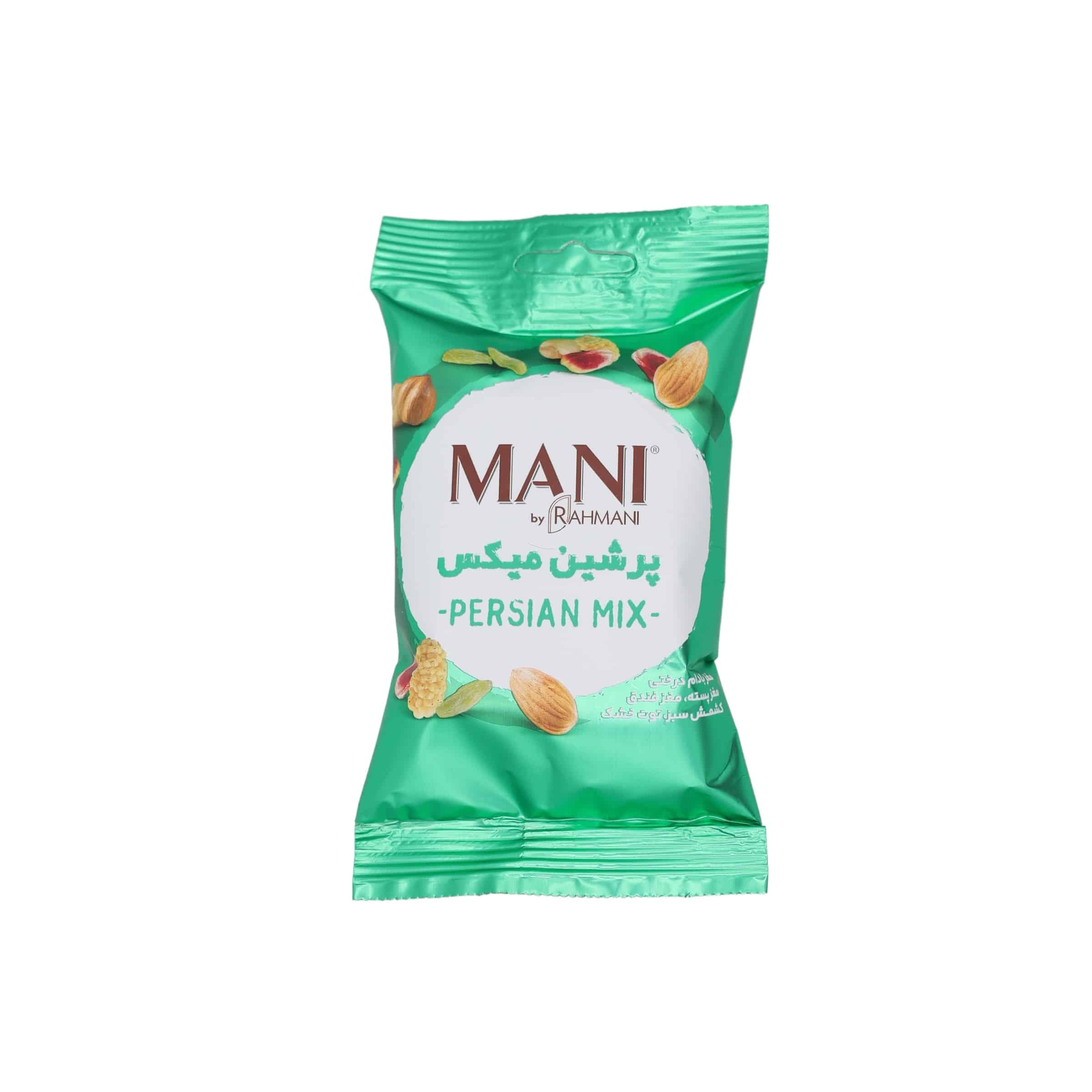 پرشین میکس مانی حاوی مغز بادام درختی، مغز پسته، مغز فندق، کشمش سبز و توت خشک