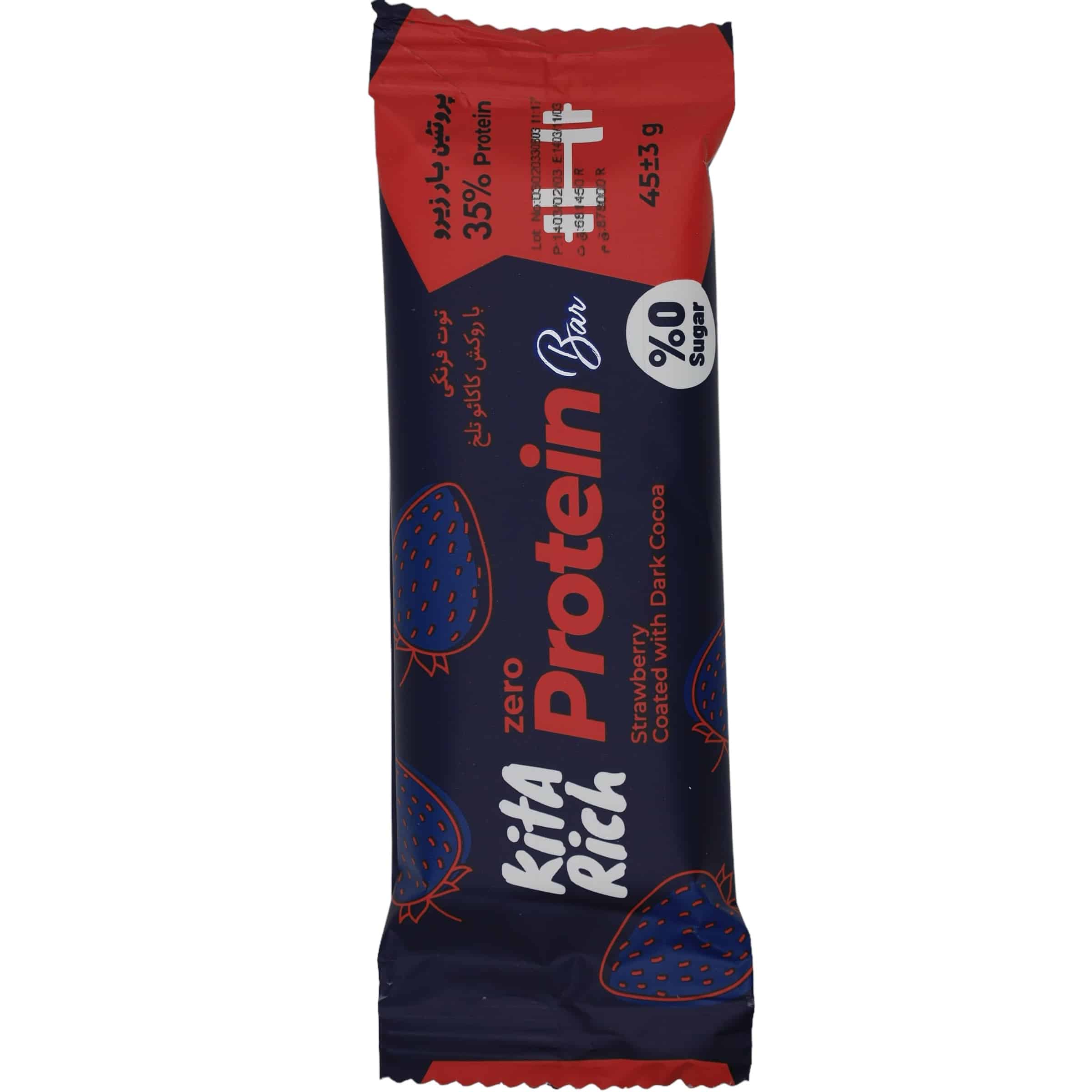 پروتئین بار 35 درصد با شکر صفر، با طعم توت فرنگی و روکش کاکائو تلخ